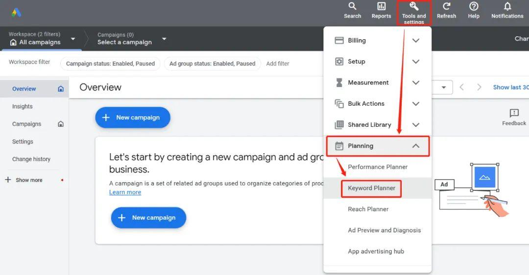 Tools and Settings(工具与设置) → Planning(规划) → Keyword Planner(关键词规划师)