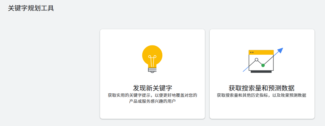 谷歌关键词规划师(Google Keyword Planner)提供了两个主要功能模块:“发现新关键词”和“获取搜索量和预测数据”。这两个工具虽然都能帮助你了解关键词表现,但它们的使用场景和目的不同。