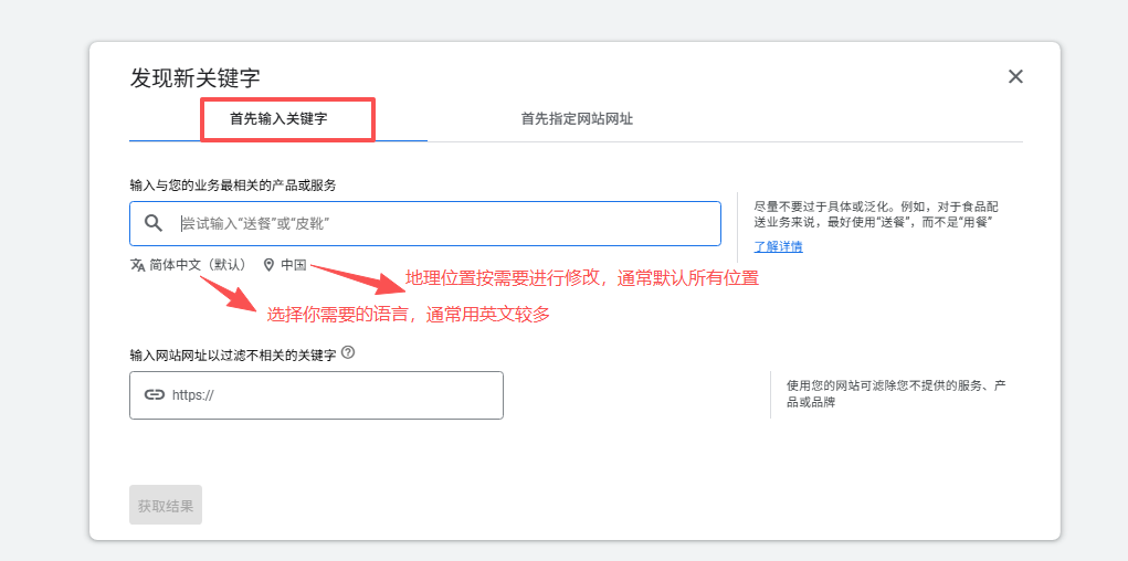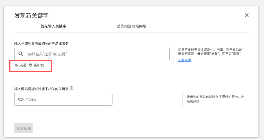 可以选择语言(例如英语)和地理位置,以获取特定市场的关键词数据。