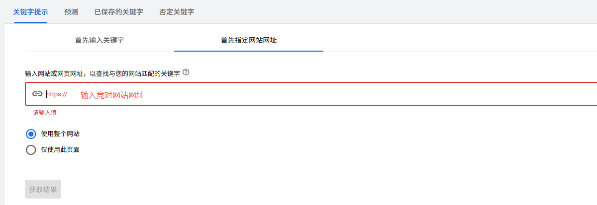 还可以输入你自己或竞争对手的网站网址,让系统自动筛选出与网站内容匹配的关键词,从而过滤掉不相关的搜索词。