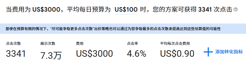 (b) 谷歌会提供这些关键词的预测数据,包括潜在的点击量(Clicks)和展示次数(Impressions)。
