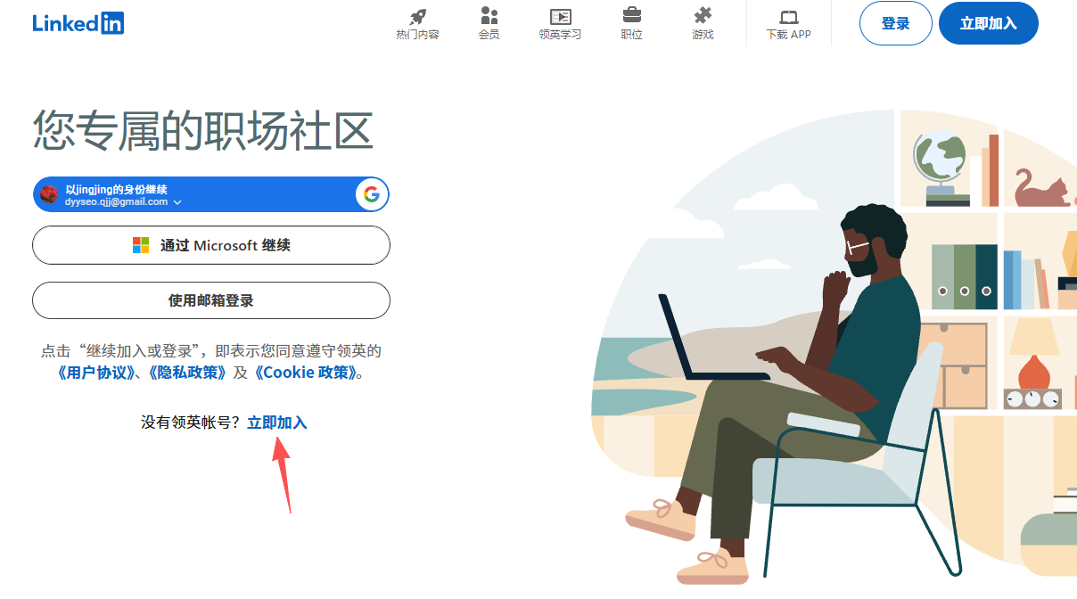 点击“立即加入”,可通过邮箱、Google、微软或Apple账号注册(Apple注册仅限苹果设备)。