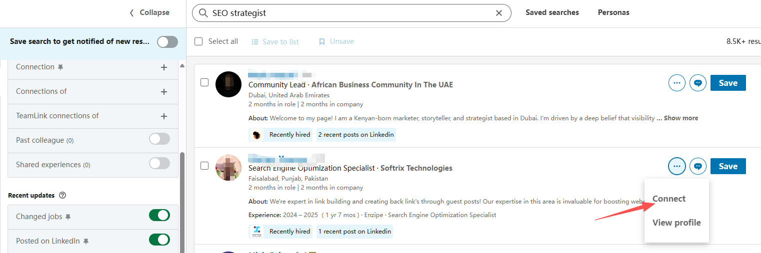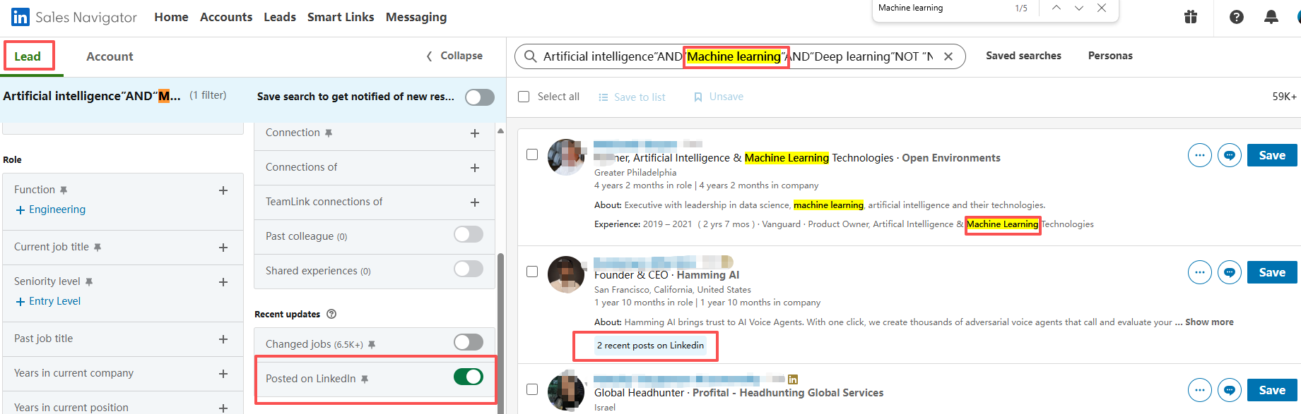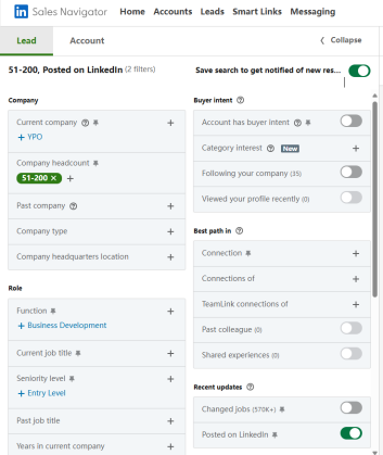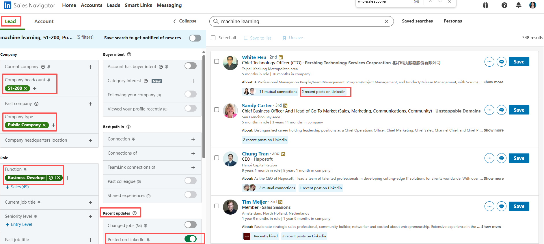 Sales Navigator 提供比普通领英搜索更强大的筛选功能。你可以根据行业、公司规模、职位级别、地区、关键词、活动状态等条件精准锁定潜在客户。通过组合过滤器,你能快速聚焦高意向客户群体,节省开发时间。