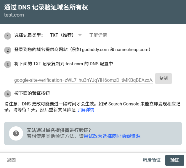 通过域名提供商,将谷歌提供的 TXT 记录 添加到域名的 DNS 配置中进行验证。