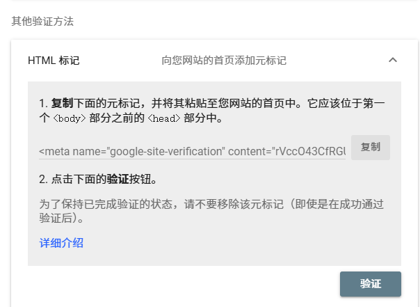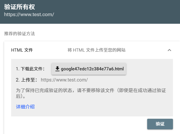 谷歌提供一个HTML 验证文件下载链接。