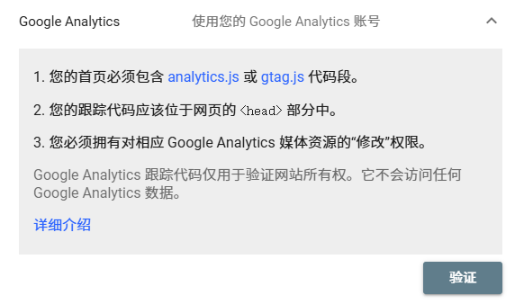 如果网站已经部署了 Google Analytics(分析) 代码,并使用相同的谷歌账号,可以直接通过 Analytics 帐号验证。