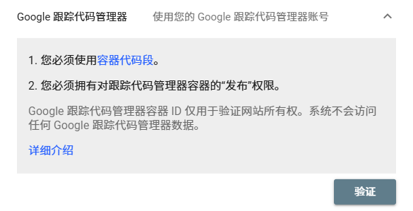 如果网站使用 Google Tag Manager(GTM) 管理标签,也可以通过 GTM 容器代码进行验证。