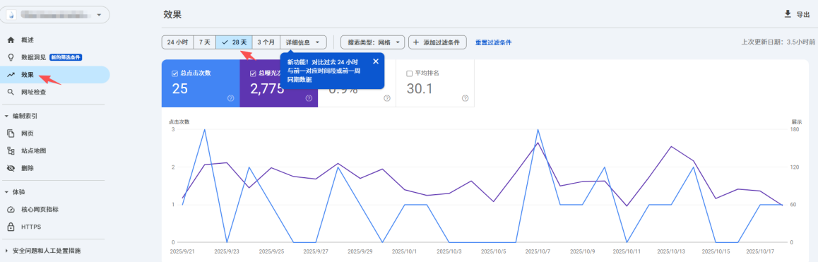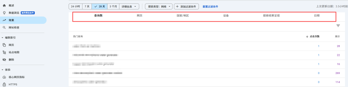 效果报告是Google Search Console最核心的功能,可查看网站点击次数、曝光次数、点击率(CTR)和平均排名等数据,全面了解网站在谷歌搜索中的表现。