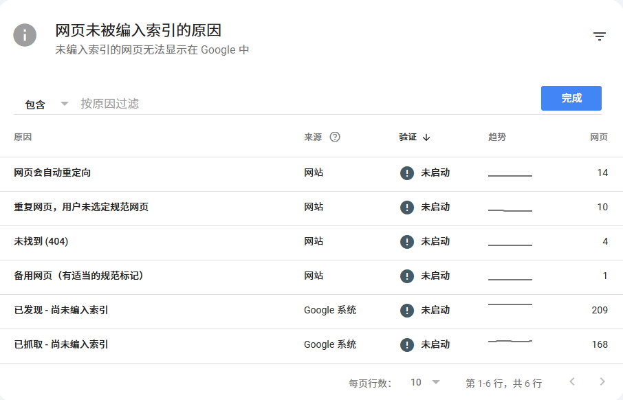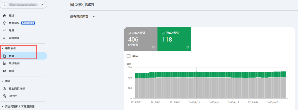 查看已索引页面和存在问题的页面及错误类型。