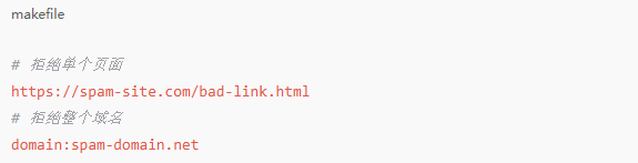 创建disavow.txt,每行填写需拒绝的链接URL或域名,如: