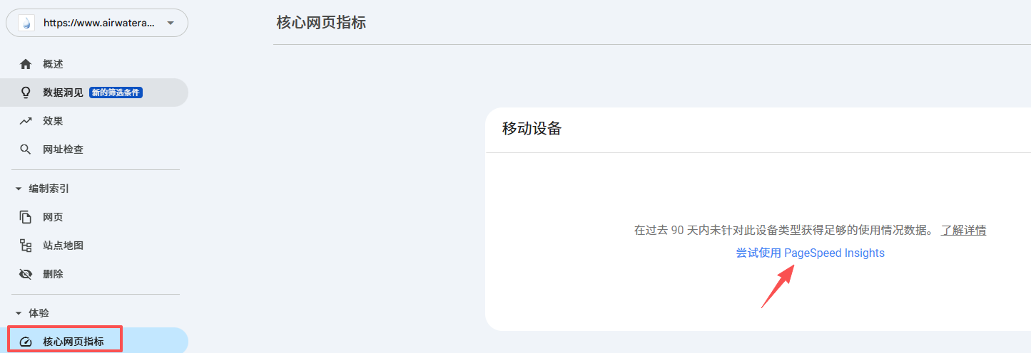 访问移动设备易用性报告:在“核心网页指标”查看网站移动端表现。